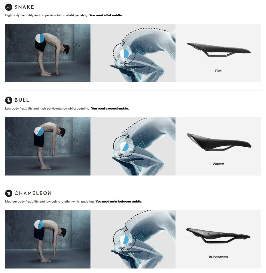 Une selle vélo exceptionnelle pour les morphologies Serpents dans le spine concept Fizik ! Elle propose une longue surface d’appuis pour pouvoir modifier sa position en fonction du relief.